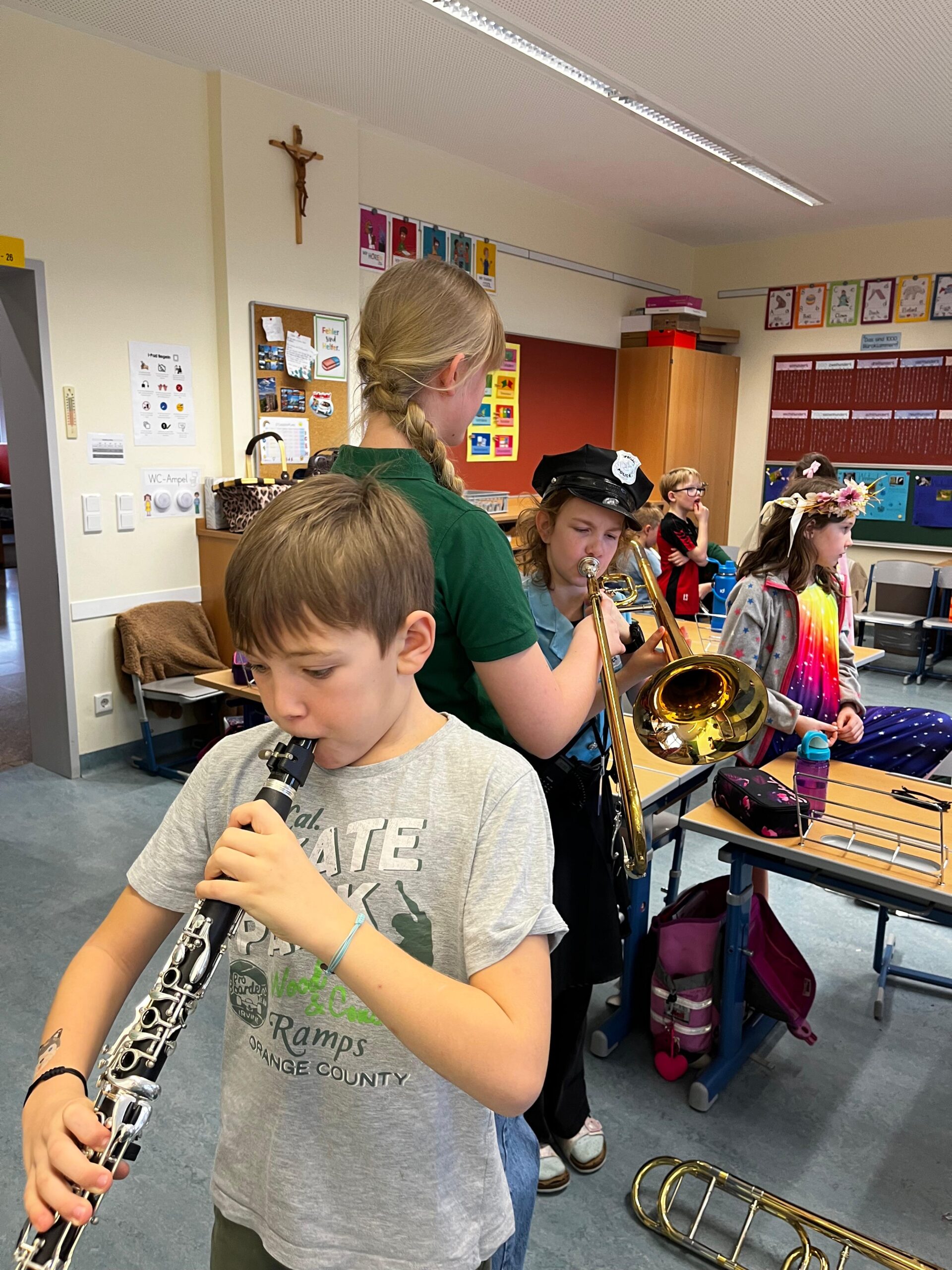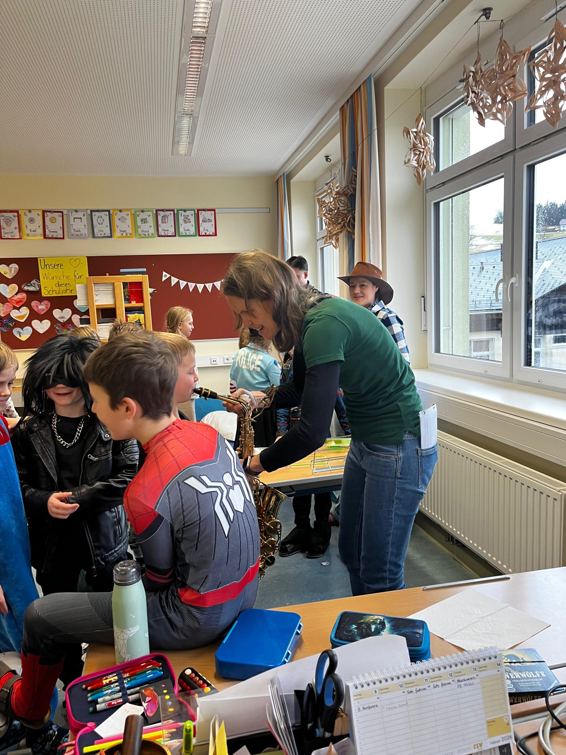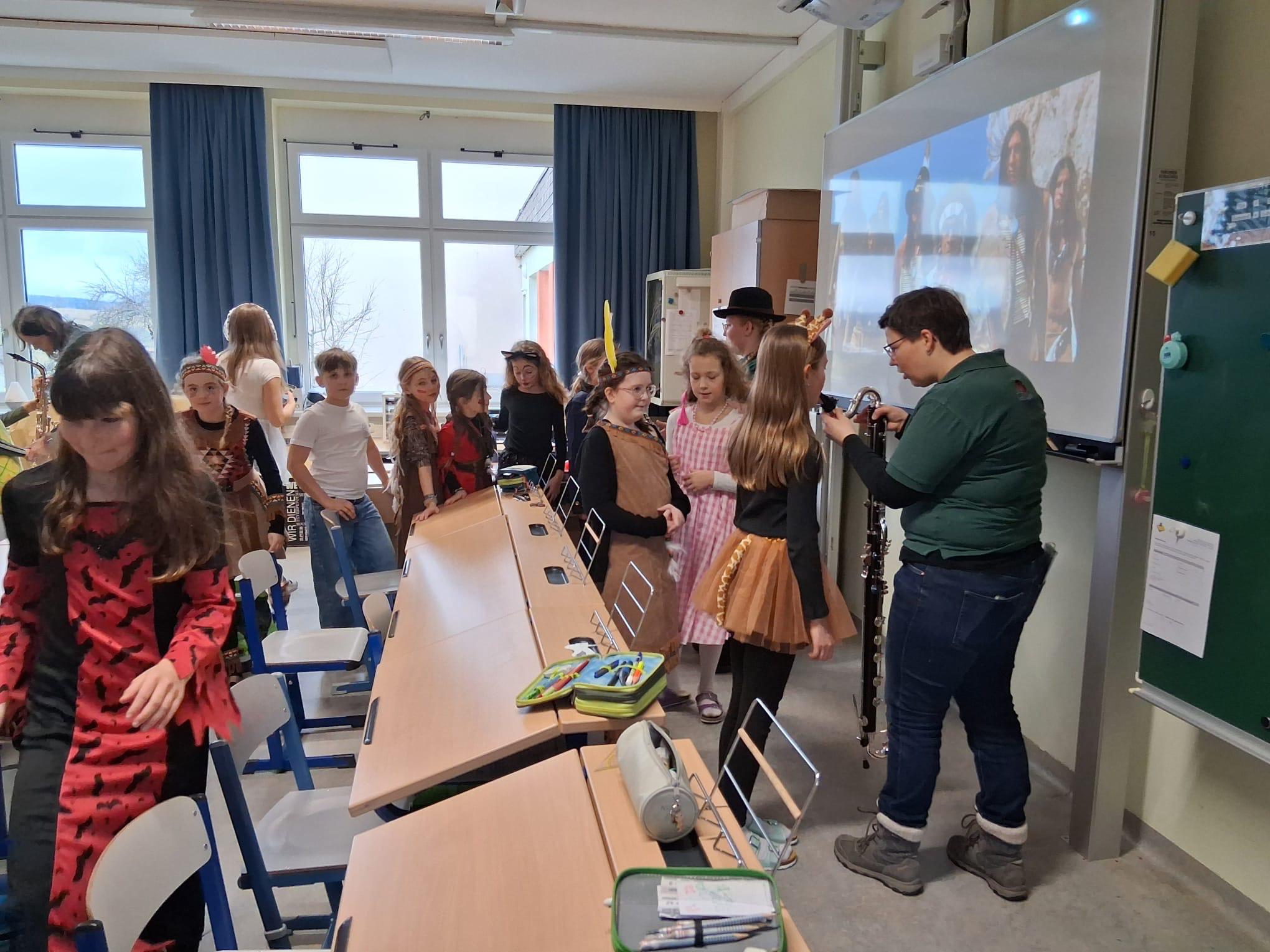 Die Musikerinnen und Musiker zogen von Klasse zu Klasse, spielten beim Betreten gemeinsam ein Stück und sorgten damit gleich für Begeisterung – ebenso wie mit der Frage, warum sie wohl da seien. Die kreativen Antworten der verkleideten Kinder („Weil Fasching ist!“ oder „Weil ihr Zeit habt!“) sorgten für viele Lacher.