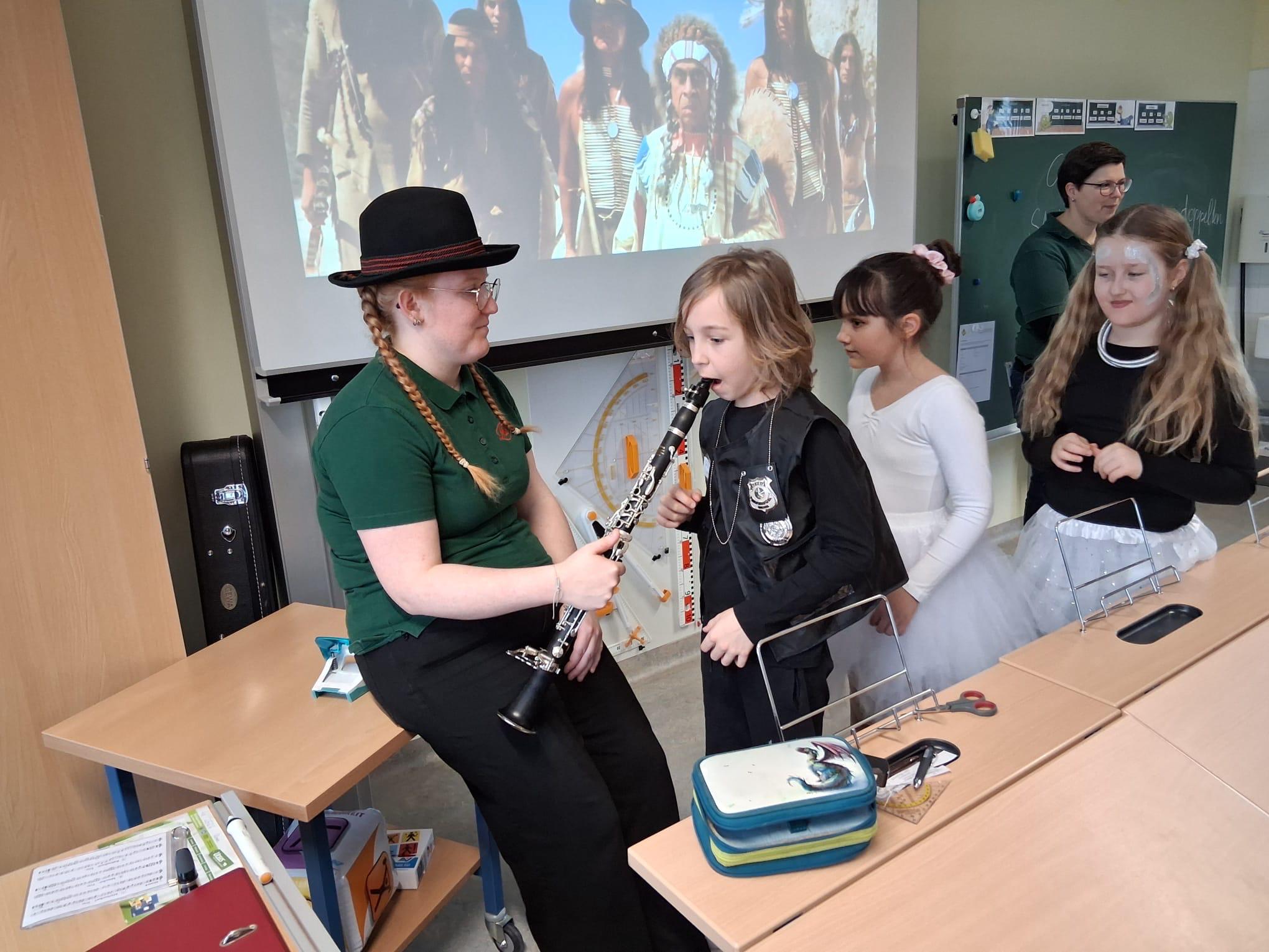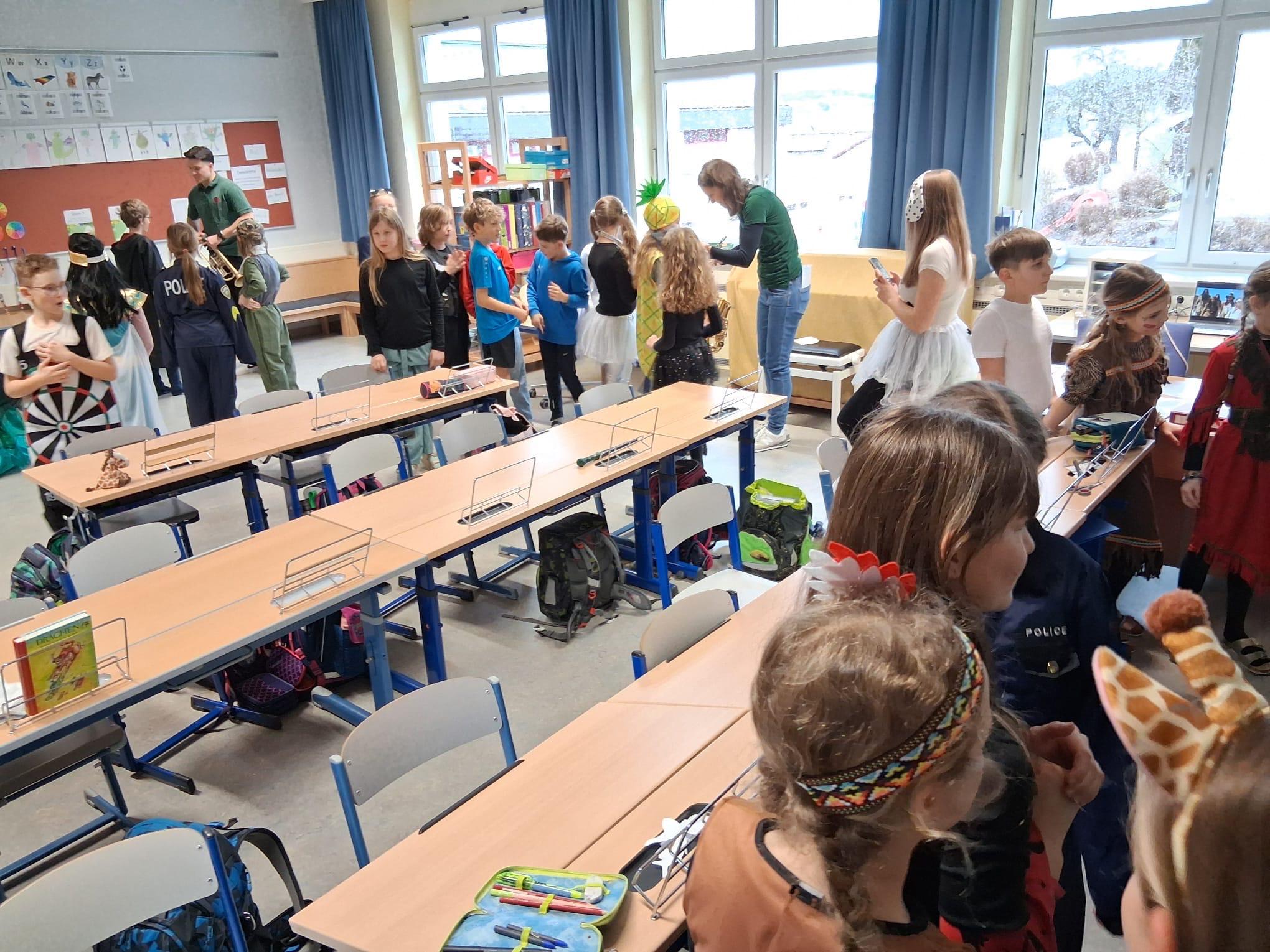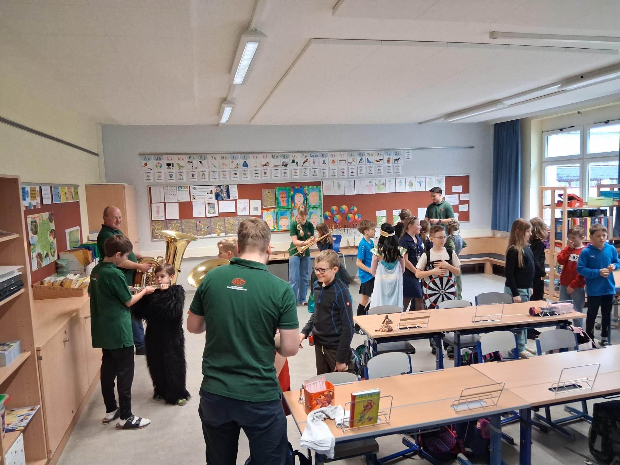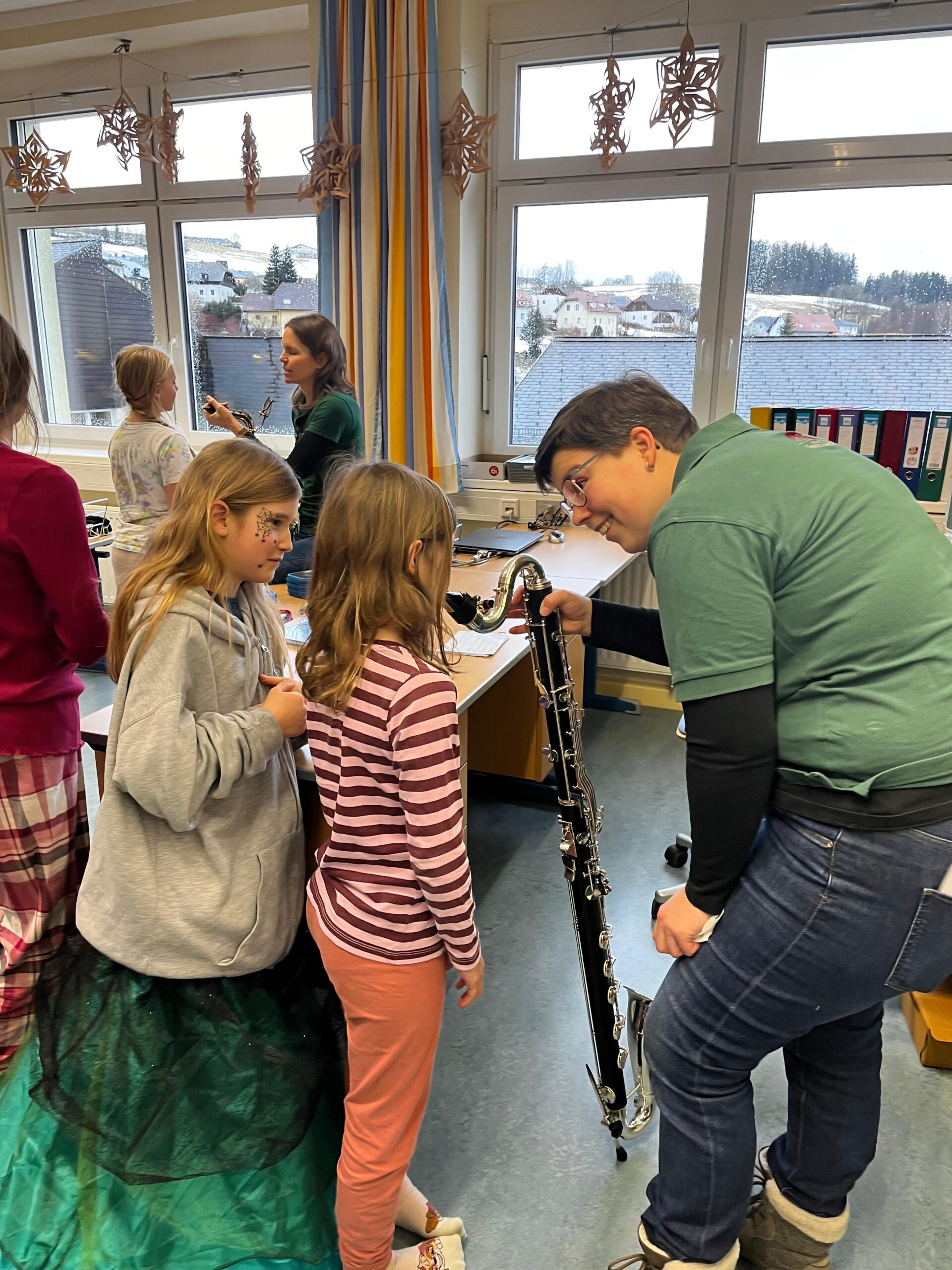 Die Musikerinnen und Musiker zogen von Klasse zu Klasse, spielten beim Betreten gemeinsam ein Stück und sorgten damit gleich für Begeisterung – ebenso wie mit der Frage, warum sie wohl da seien. Die kreativen Antworten der verkleideten Kinder („Weil Fasching ist!“ oder „Weil ihr Zeit habt!“) sorgten für viele Lacher.