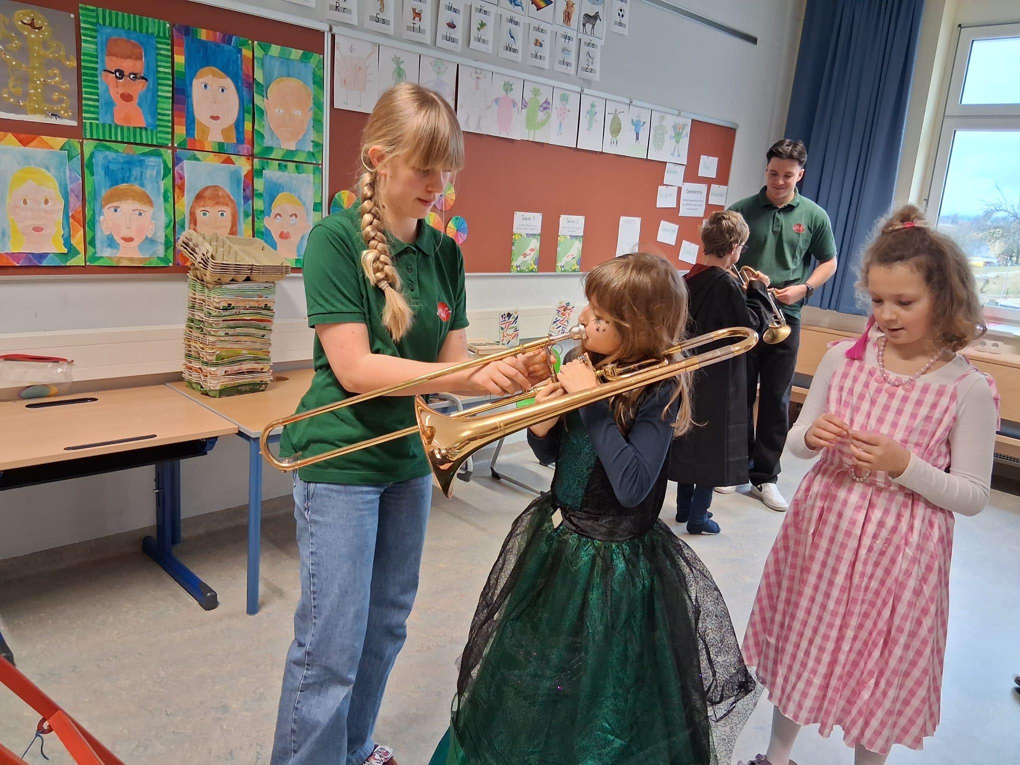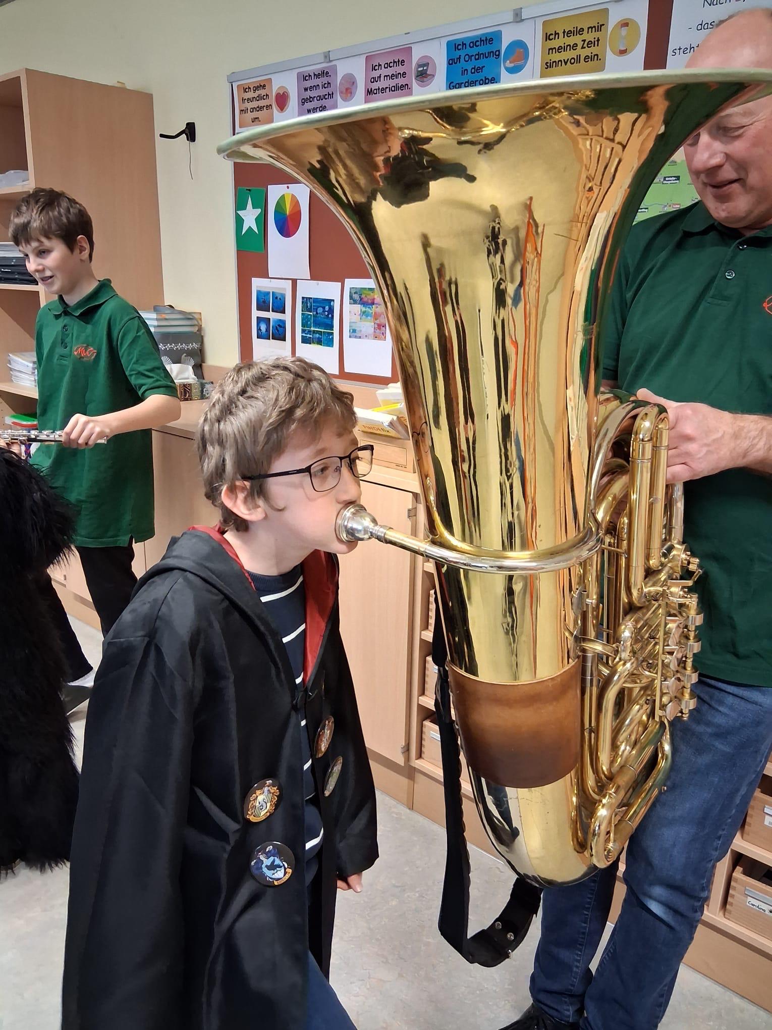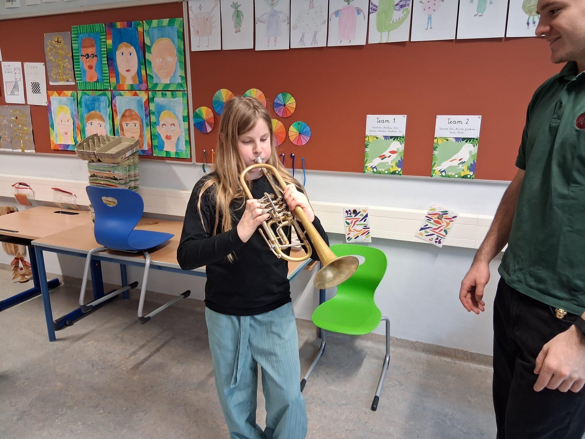 Der Höhepunkt des Besuchs war schließlich das Ausprobieren der Instrumente. Mit großer Neugier testeten die Kinder verschiedene Blasinstrumente und konnten so selbst erleben, wie Töne auf einem Blasinstrument entstehen.