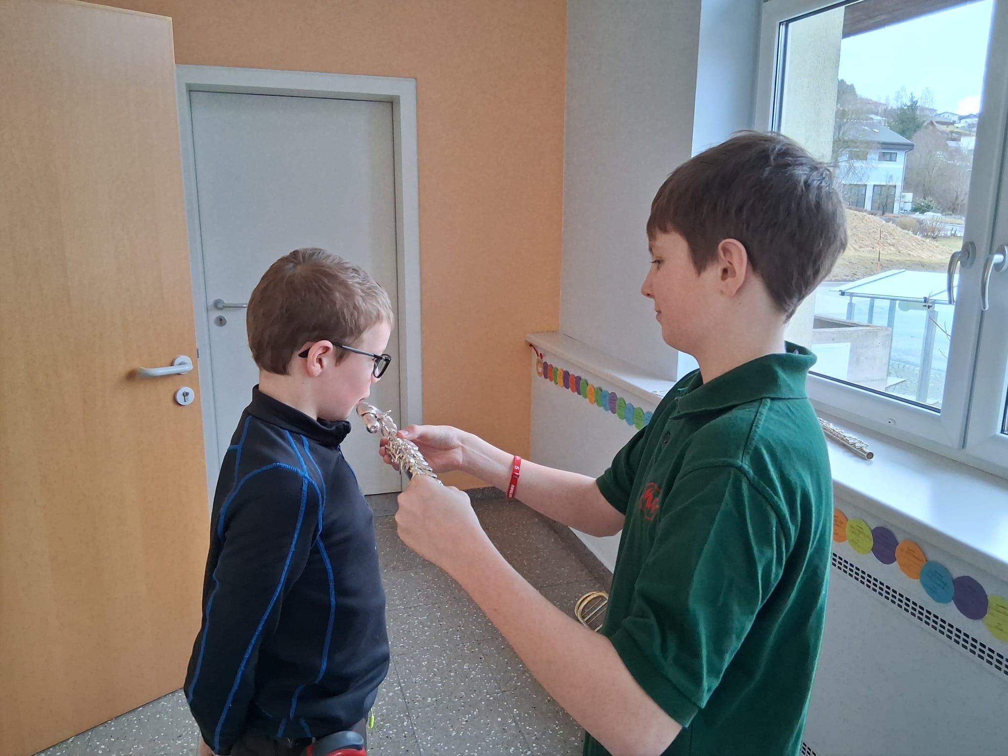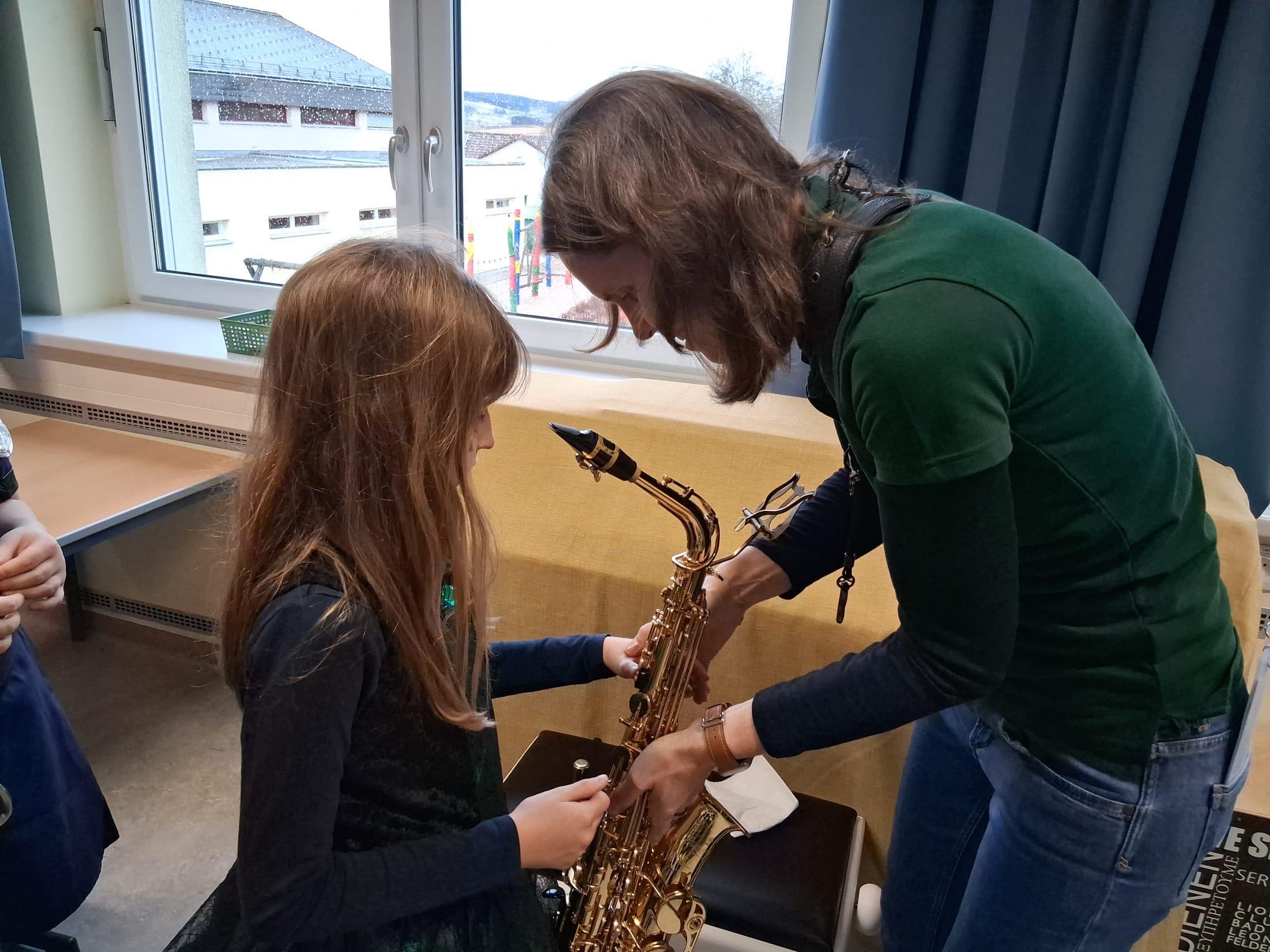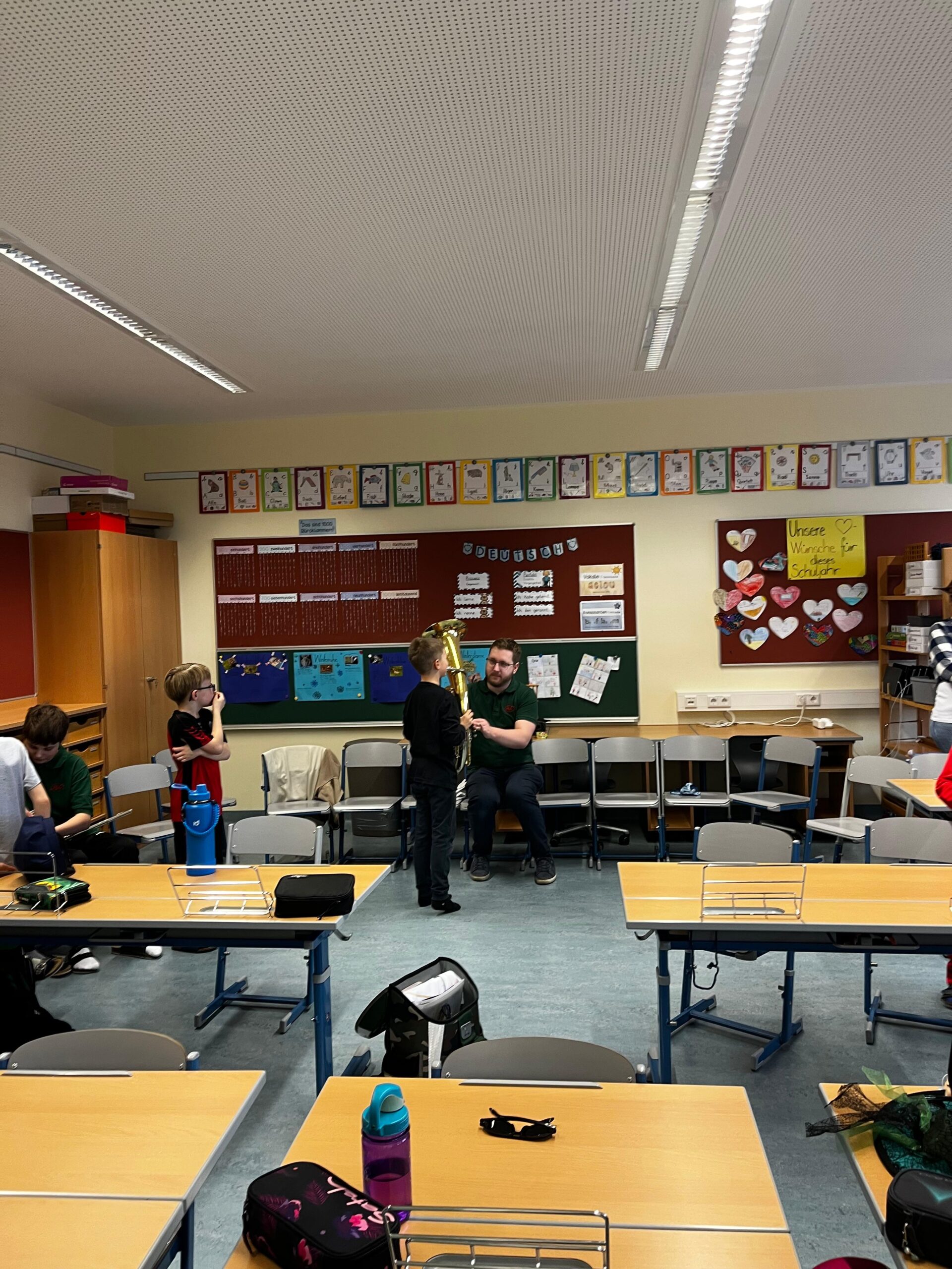 Der Höhepunkt des Besuchs war schließlich das Ausprobieren der Instrumente. Mit großer Neugier testeten die Kinder verschiedene Blasinstrumente und konnten so selbst erleben, wie Töne auf einem Blasinstrument entstehen.
